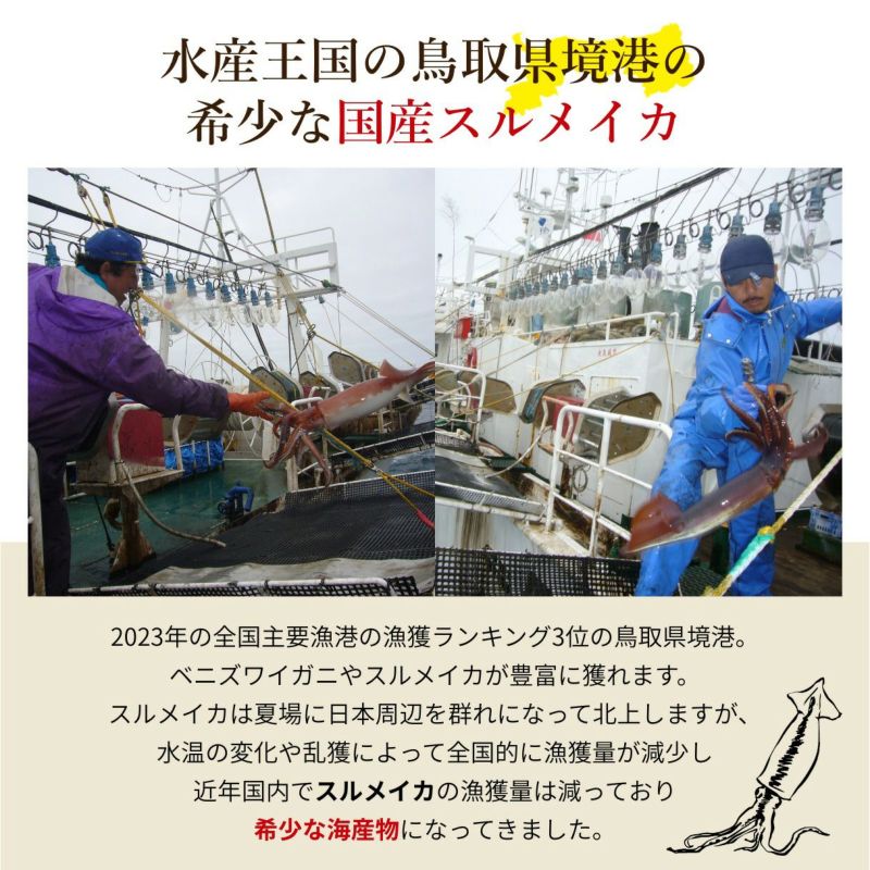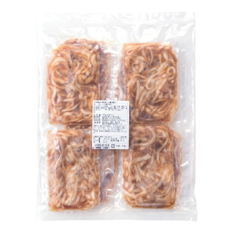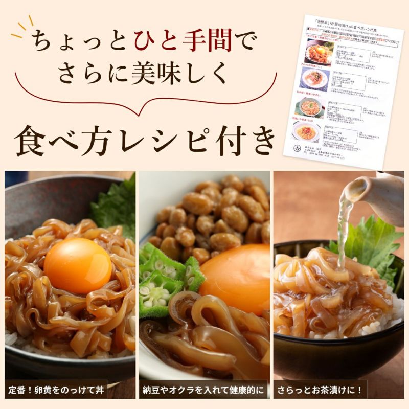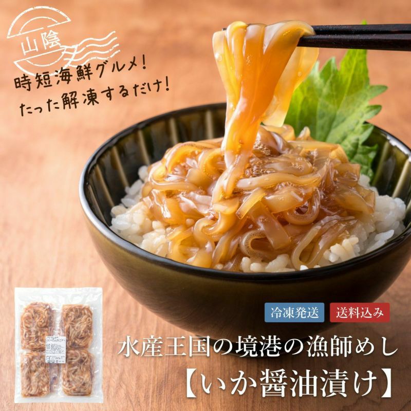 漁船を所有している網元や漁師たちから愛されているスルメイカの醤油漬けがあります。日本海で漁獲された鮮度の良いスルメイカを使用。細切りした胴体・耳部分を自家製の醤油ダレに漬け込みました。 解凍してそのままお召し上がれるので簡単!お子様から大人まで食べやすい逸品です。