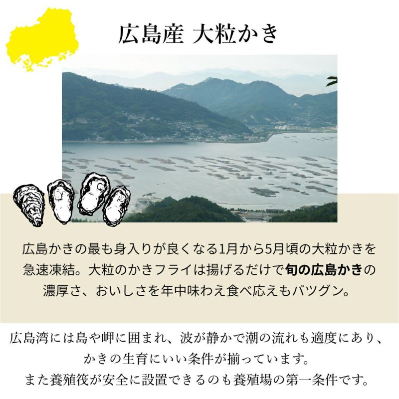 広島かきの最も身入りが良くなる1月から5月頃の大粒かきを急速凍結。 大粒のかきフライは揚げるだけで旬の広島かきの濃厚さ、おいしさを年中味わえ食べ応えもバツグン。