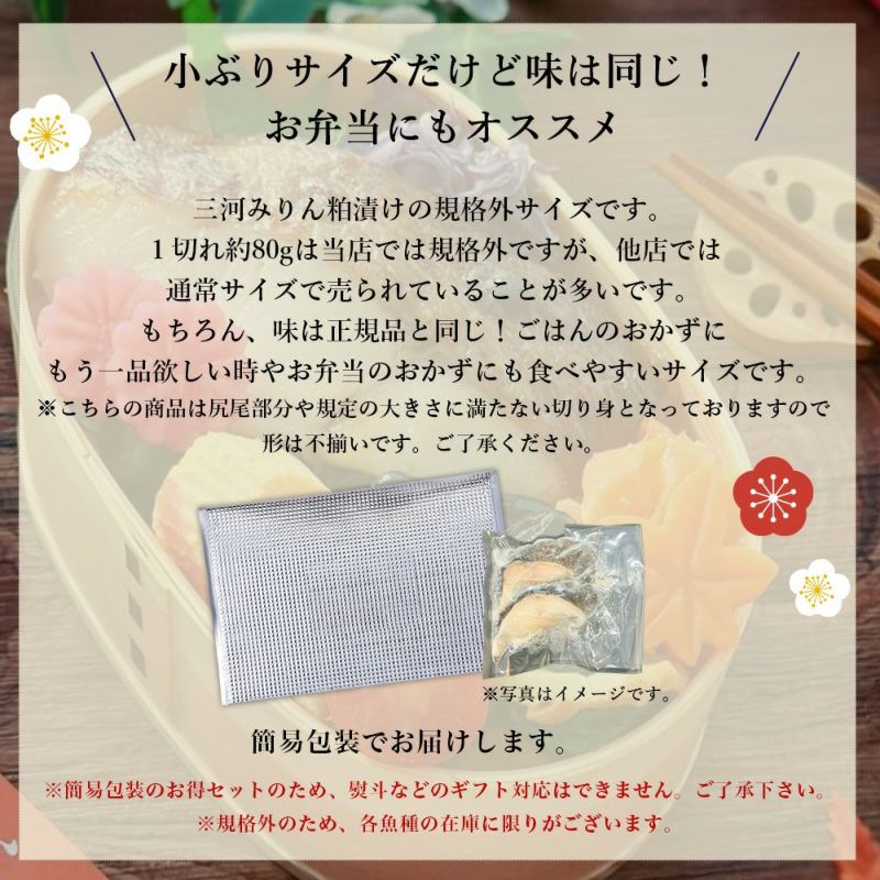 三河みりん粕漬けの規格外サイズです。1切れ約80gは当店では規格外ですが、他店では通常サイズで売られていることが多いです。もちろん、味は正規品と同じ!ごはんのおかずにもう一品欲しい時やお弁当のおかずにも食べやすいサイズです。