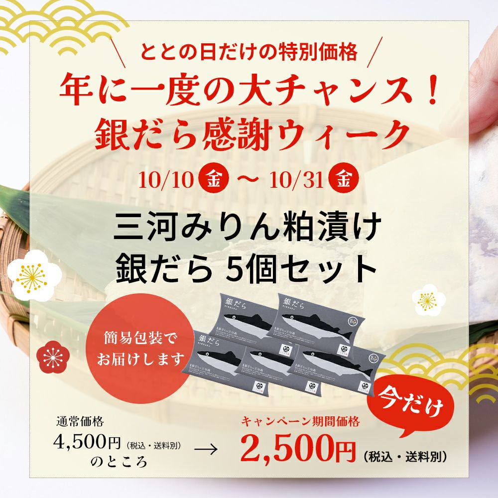 他の画像を見る ブラックフライデーセール 【数量限定】三河みりん粕漬け 銀だら 5個セット クール便(冷凍) 定価 ¥ 4,500 のところ 販売価格 ¥ 2,500 税込 販売開始前です。 販売期間 2025/11/28 0:00 〜 2025/12/07 23:59 銀だらのとろけるような食感と、みりん粕が甘みをより一層引き立てます。 希少な三河みりん粕を使用した粕漬けをぜひご堪能下さい。 王道の銀だらは、食感、味ともにみりん粕漬けを代表するお魚です。脂がのった銀だらは、とろけるような柔らかさで本来の魚の旨味とみりん粕の相性抜群。至福の味わいをぜひご堪能下さい。 詳細を見る お気に入りに登録する